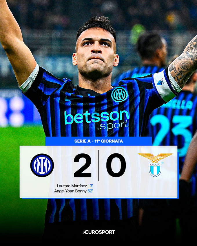 Chuyển sang vòng 11 Serie A, Inter đã có chiến thắng nhẹ nhàng 2-0 khi tiếp đón Lazio trên sân nhà. Những người ghi bàn cho Nerazzurrri là Lautaro Martinez và Bonny. Trận thắng này giúp Inter leo lên ngôi đầu trên BXH với 24 điểm sau 11 trận.