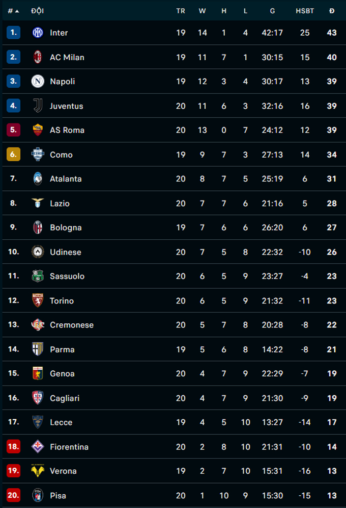 | Serie A - Vòng 23 | |||