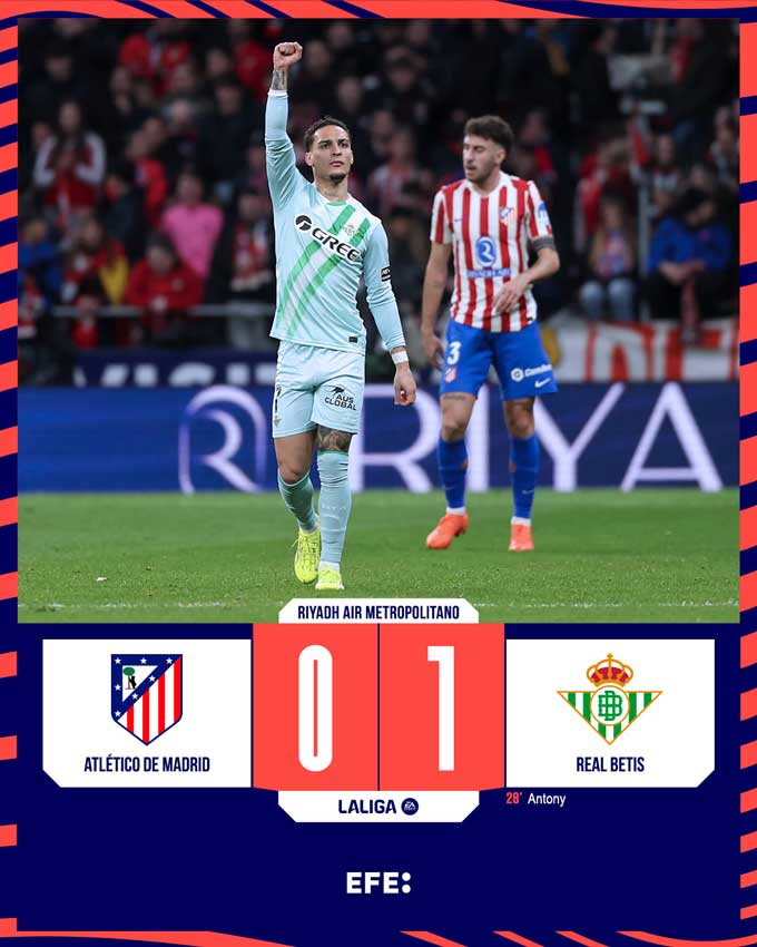 Trong khi đó, đội bóng cùng thành phố Atletico lại phải nhận thất bại đau đớn ngay trên sân nhà trước Real Betis. Ngay ở phút 28, đội khách đã khai thông thế bế tắc. Antony mang tới khác biệt với tình huống dứt điểm từ xa táo bạo, đưa bóng vào góc gần khiến thủ môn Oblak bất ngờ.