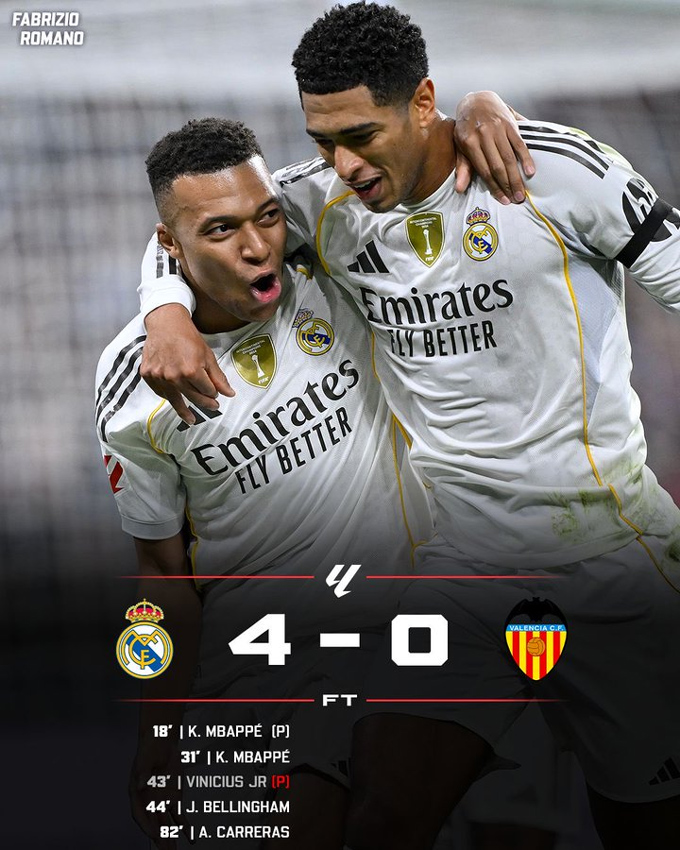 Tại vòng 11 La Liga, Real Madrid đã có chiến thắng tưng bừng 4-0 trên sân nhà trước Valencia. Kylian Mbappe lập cú đúp (1 bàn từ phạt đền) trong khi Jude Bellingham và Alvaro Carreras ghi 2 bàn còn lại. Đáng chú ý, Vinicius cũng có cơ hội ghi bàn nhưng lại sút hỏng phạt đền.