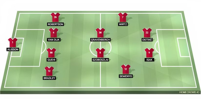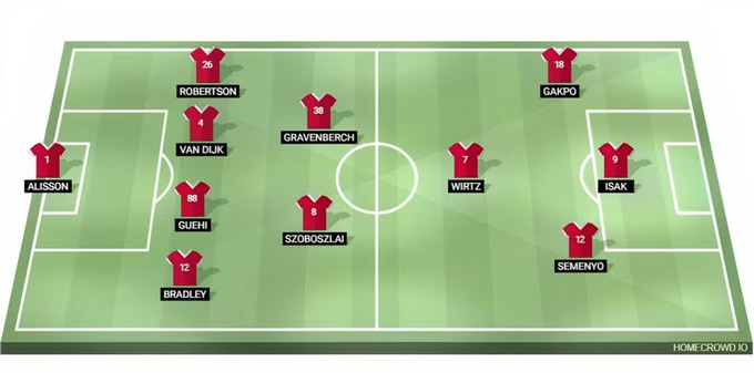 Hậu vệ người Hungary đang gặp khó, phần lớn do không có sự kết nối với Gakpo - người không góp mặt trong đội hình xuất phát này. Wirtz có thể trở thành tác với Kerkez về lâu dài, nhưng Robertson có lẽ vẫn là lựa chọn ưu tiên. Semenyo sẽ xuất phát ở cánh phải còn Ekitike và Isak cùng đá cặp tiền đạo.