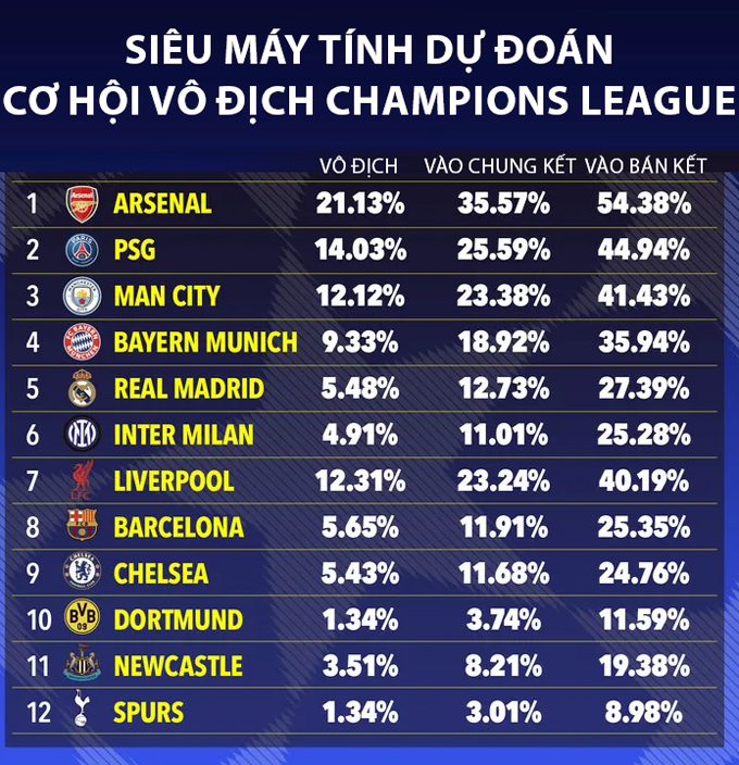 Ở nửa cuối bảng dự đoán, Barca và Newcastle United chỉ có cơ hội rất nhỏ để lên ngôi. Điều này cho thấy mùa giải năm nay đang mở ra viễn cảnh mới, nơi Arsenal có thể viết lại lịch sử Champions League bằng chức vô địch đầu tiên.
