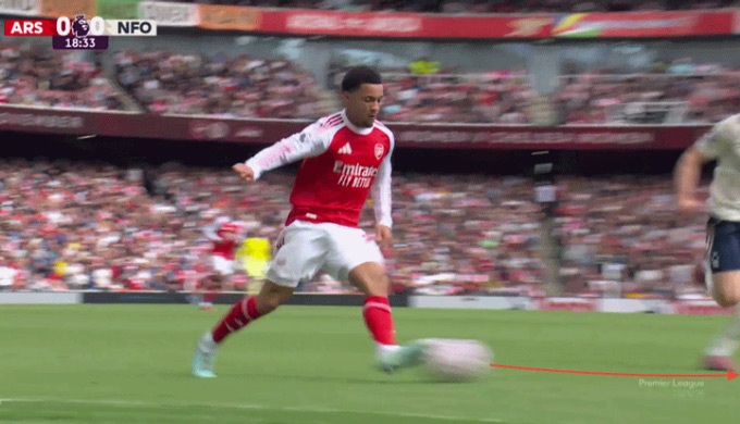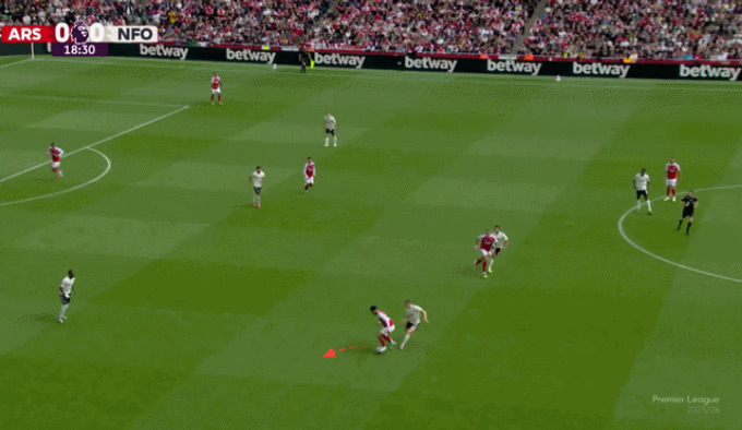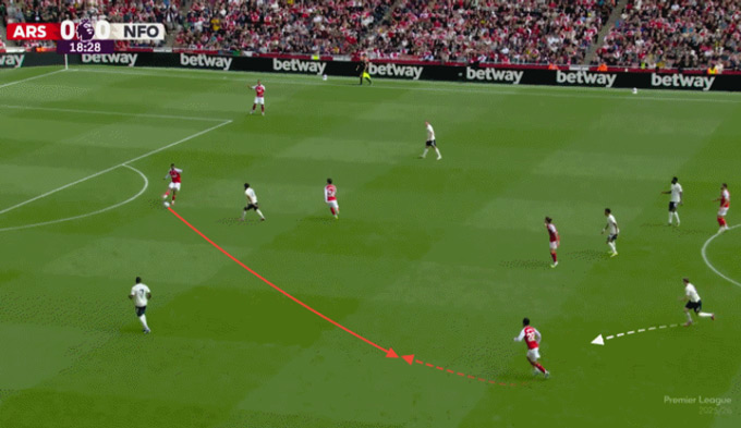 Ví dụ, trong giai đoạn tiền mùa giải, Nwaneri đã bắt đầu nhận bóng và triển khai từ những vị trí thấp hơn - minh chứng là pha xử lý trước Villarreal. Và chỉ vài phút sau khi vào sân ở trận gặp Forest, Nwaneri có một tình huống tương tự: đánh lừa cầu thủ theo kèm rồi chuyền bóng để Madueke cắt vào trong.