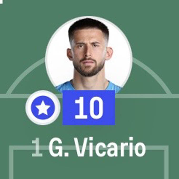 Vicario có 8 lần cứu thua, ngăn chặn tỷ lệ bàn thua kỳ vọng lên tới 2,68 (xG). Thủ môn 29 tuổi cũng cho thấy sự dứt khoát trong việc cắt bóng và phán đoán tình huống khi không mắc bất cứ sai lầm nào.