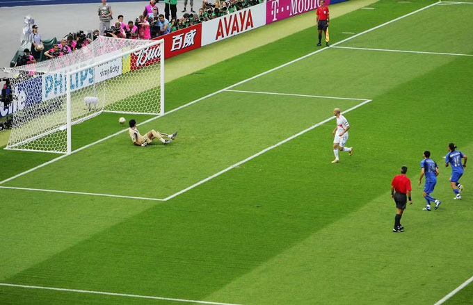 Trước một Buffon có tiếng phản xạ nhanh nhạy song Zizou vẫn thực hiện thành công cú sút phạt đền ở phút thứ 7, giúp ĐT Pháp vươn lên dẫn trước với tỷ số 1-0. Trái bóng chạm mép dưới xà rồi đập xuống đất, trước khi bật trở lại đập vào mép xà lần nữa và văng ra ngoài.