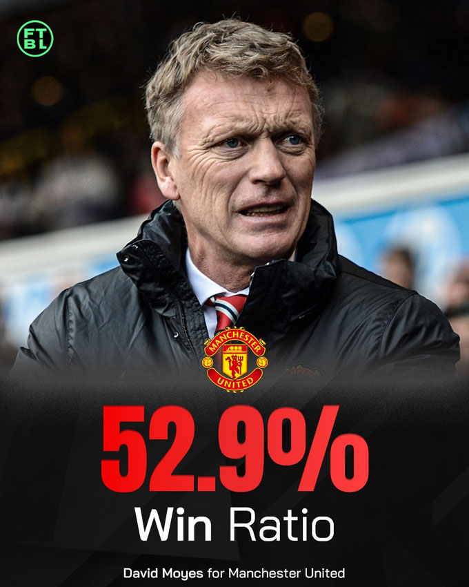 Cái tên David Moyes thường được nhắc đến như biểu tượng cho sự sụp đổ sau Sir Alex, nhưng xét về số liệu, ông thậm chí còn có tỷ lệ thắng cao hơn Van Gaal và Amorim. Dẫu vậy, việc chỉ trụ lại chưa đầy một mùa giải, đánh mất bản sắc và khiến MU tụt dốc không phanh đã khiến Moyes bị xem là một trong những HLV thất bại nhất về mặt ảnh hưởng lâu dài.