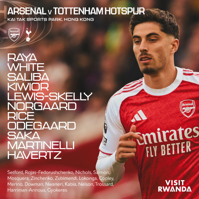 Arsenal: Raya, Ben White, Saliba, Kiwior, Lewis-Skelly, Norgaard, Rice, Odegaard, Saka, Martinelli, Havertz