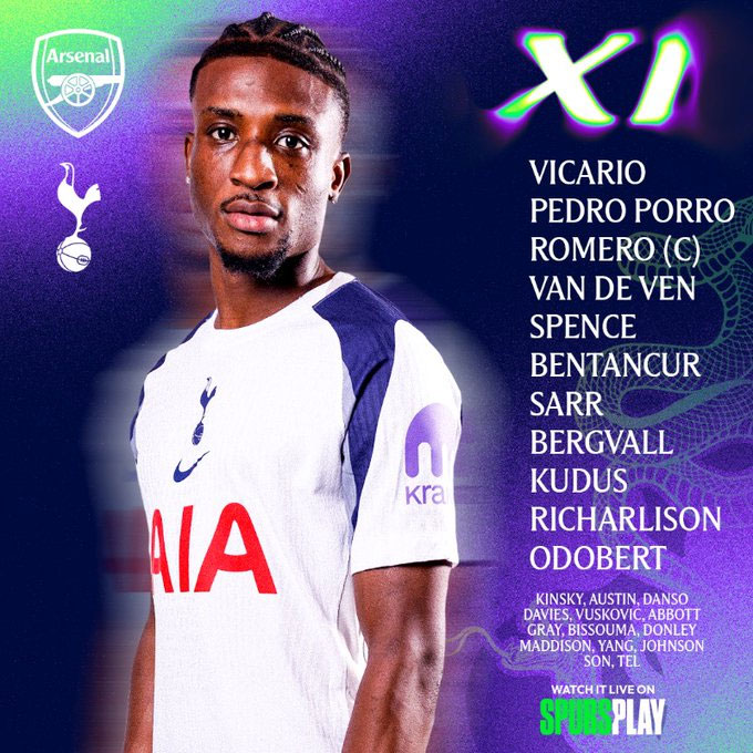Tottenham: Vicario, Porro, Van De Ven, Romero, Spence, Bergvall, Sarr, Bentancur, Odobert, Kudus, Richarlison