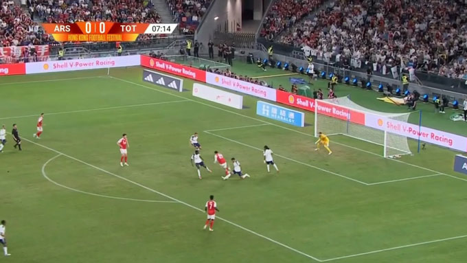 Từ quả đá phạt góc của Saka bên cánh phải, Odegaard tung ra cú dứt điểm đưa bóng đi chệch cột dọc trong gang tấc. Arsenal đang tạo ra sức ép lớn lên hàng thủ của Tottenham.