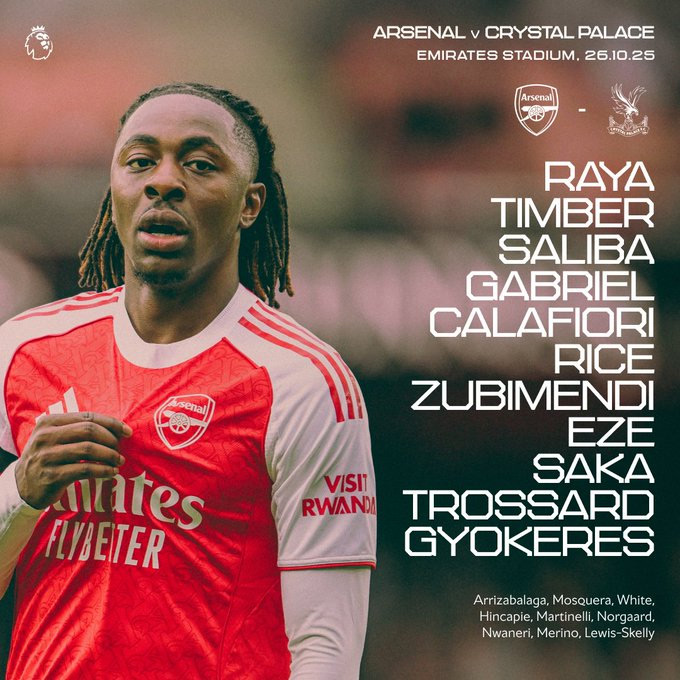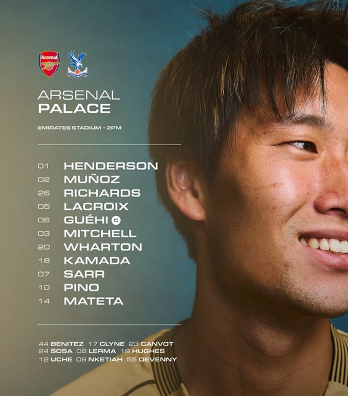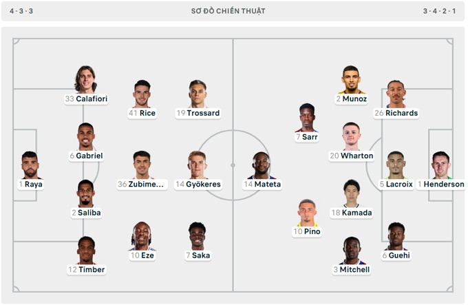 Ở cuộc tiếp đón Palace hôm nay, Arsenal ra sân với hệ thống 4-3-3. Bộ tứ vệ vẫn là những cái tên quen thuộc gồm Calafiori, Gabriel, Saliba, Timber. Đá bên trên là 3 tiền vệ Rice, Zubimendi và Eze. Bộ ba tấn công được HLV Arteta lựa chọn là Trossard, Gyokeres và Saka.