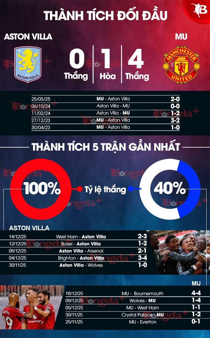 Về phần MU, sau khi để thua Aston Villa trong lần đầu 2 đội gặp nhau ở Premier League, họ chỉ để điều tương tự xảy ra ở 4/59 trận đấu kế tiếp tại sân chơi số 1 xứ sở sương mù. Với 41 lần để thua MU kể từ năm 1992, Aston Villa chính là đội nhận nhiều thất bại thứ 2 dưới tay Quỷ đỏ sau Everton (42 trận) ở giải Ngoại hạng Anh.