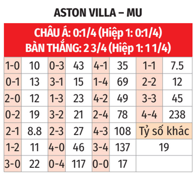 Trên 2 bàn: 3/4 trận gần đây của Aston Villa đều có tối thiểu 3 bàn. 7/9 trận gần nhất của MU số lần lưới rung cũng đều chạm tới ngưỡng 3.