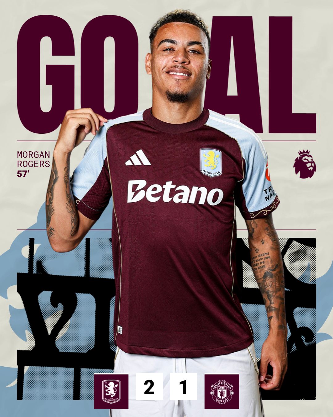 VÀOOO!!! Rogers lại lần nữa tỏa sáng với pha dứt điểm chất lượng giúp Villa lần thứ 2 dẫn trước MU. 2-1 cho Aston Villa và một lần nữa, Yoro không thể kèm được Rogers.