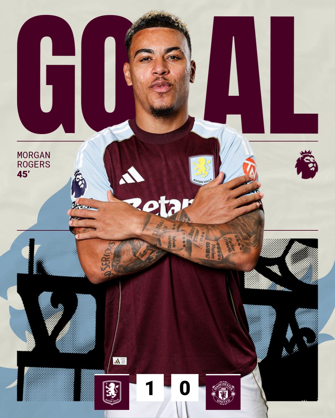 45'VÀOOO!!! 1-0 cho Aston Villa. Xuất phát từ chuyền dài tốt của McGinn, Rogers từ cánh trái đi bóng vượt qua Yoro rồi cứa lòng hoàn hảo về góc xa làm bó tay Lammens.