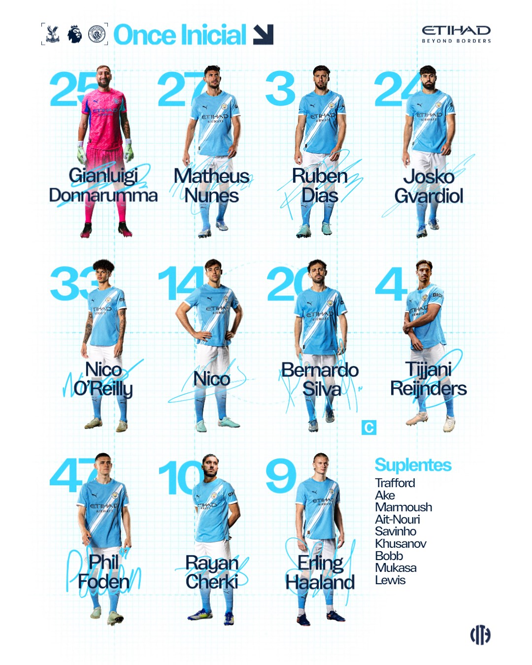 Man City: Donnarumma, Nunes, Dias, Gvardiol, O'Rielly, Bernardo Silva, Nico, Reijinders, Cherki, Foden, Haaland