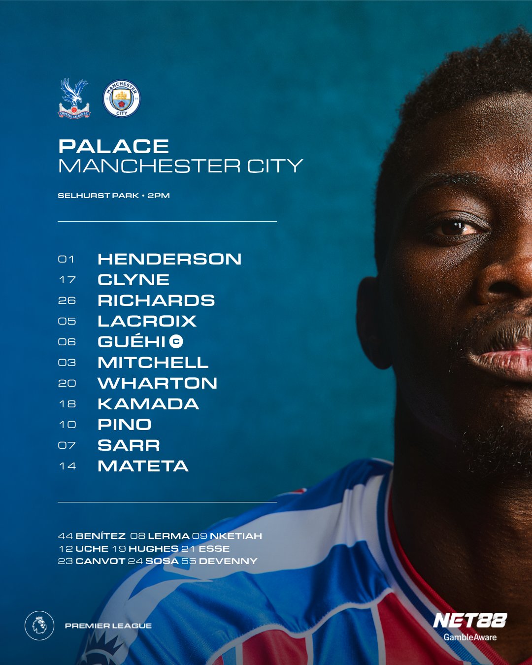 - Crystal Palace (3-4-2-1): Henderson; Richards, Lacroix, Guehi; Clyne, Wharton, Kamada, Mitchell; Pino, Nketiah; Mateta