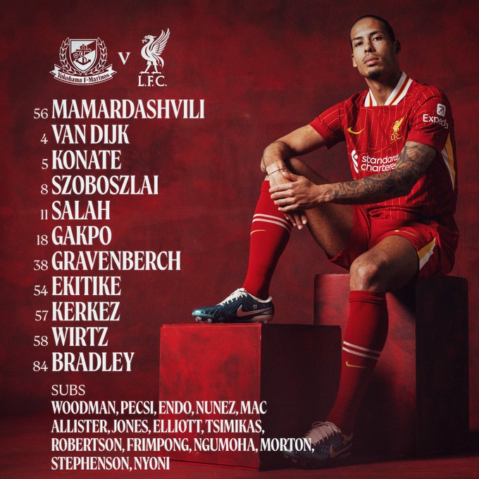 Liverpool: Mamardashvili, Van Dijk, Konate, Kerkez, Bradley, Wirtz, Gravenberch, Gakpo, Salah, Szoboszlai, Ekitike