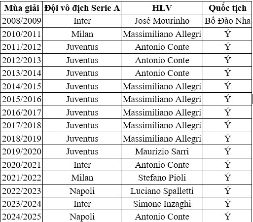 15 năm qua, chỉ HLV người Ý mới vô địch Serie A