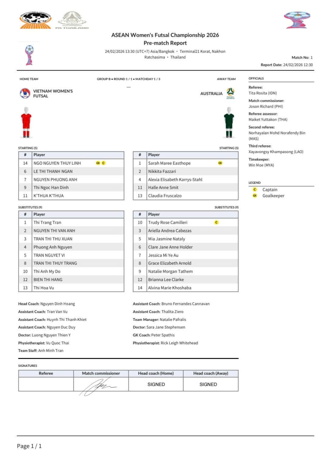- ĐT futsal nữ Australia mới được thành lập trong vài năm trở lại đây. Trong thời gian qua, đội bóng này đã tham dự VCK futsal nữ châu Á 2025 với 3 trận thua trước Trung Quốc, Uzbekistan và Đài Bắc Trung Hoa. Dẫn dắt ĐT futsal nữ Australia tham dự giải futsal nữ Đông Nam Á 2026 là ông Bruno Cannavan.
