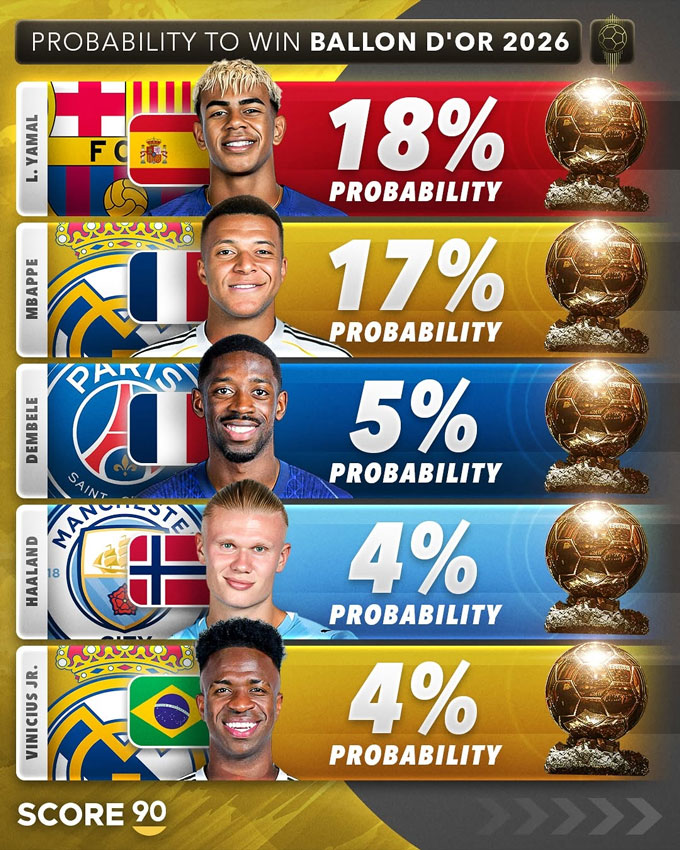 Theo thống kê từ oddschecker, T năng trẻ Lamine Yamal hiện được đánh giá cao nhất cho khả năng giành Quả Bóng Vàng 2026, với tỷ lệ cược 4/1 (tương đương khả năng chiến thắng khoảng 18%).