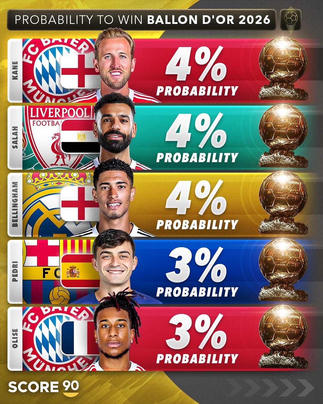 Những cái tên khác trong nhóm ứng viên tiếp theo bao gồm Erling Haaland, Vinicius Junior, Harry Kane, Mohamed Salah và Jude Bellingham, mỗi người được đánh giá có khoảng 4% khả năng giành chiến thắng.