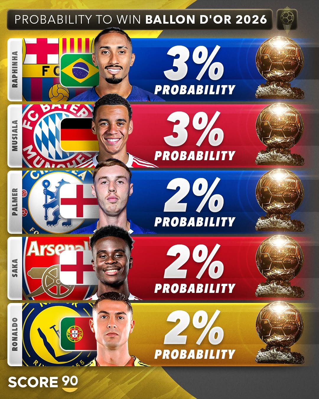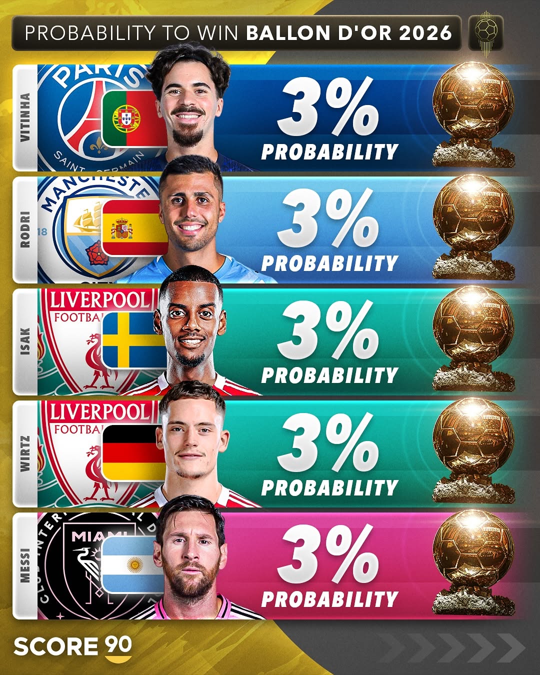 Hai huyền thoại đương đại Lionel Messi và Cristiano Ronaldo vẫn góp mặt trong danh sách, với lần lượt 3% và 2% cơ hội. Những con số này có thể tăng nếu Argentina hoặc Bồ Đào Nha đăng quang World Cup 2026 tại Mỹ, Mexico và Canada.