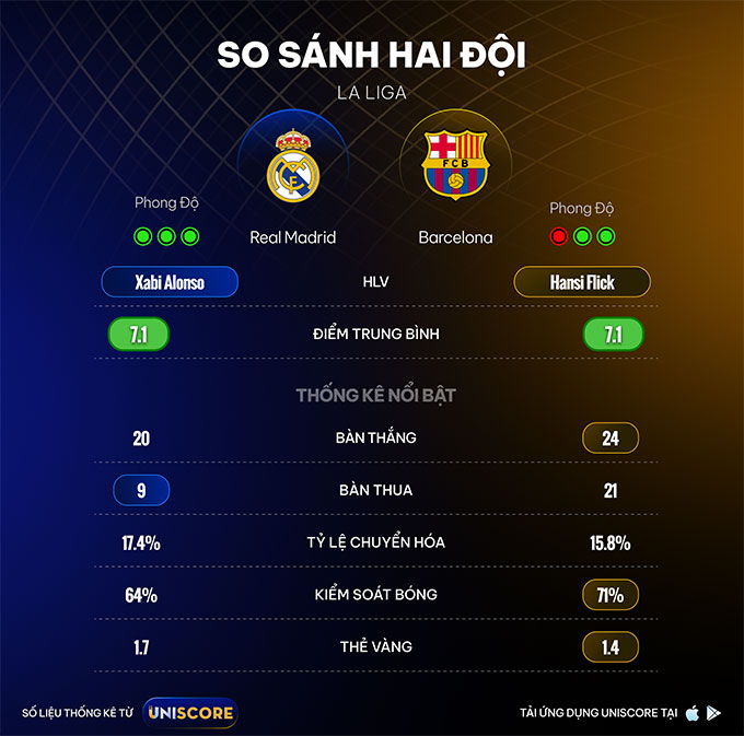 Mùa này, Real Madrid và Barcelona có nhiều điểm tương đồng về lối chơi. Dựa trên thống kê của Uniscore, Real ghi 20 bàn, thủng lưới 9 bàn; Barca ghi 24 bàn, thủng lưới 10. Real kiểm soát bóng trung bình 63.8%, thấp hơn so với Barca (70,7%). Cả hai tung ra khoảng 20 cú sút mỗi trận, nhưng Real có tỷ lệ chuyển hóa cao hơn (17,4% so với 15,8%).