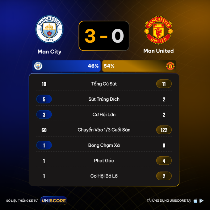 Trận derby này thêm một lần nữa cho thấy khoảng cách đáng kể giữa hai đội bóng cùng thành phố. City chứng minh sự vượt trội toàn diện - từ chiến thuật, hiệu quả tấn công đến kỷ luật phòng ngự - và tiếp tục khẳng định vị thế ứng cử viên vô địch. Còn United cần nhanh chóng tìm ra hướng đi mới nếu không muốn có thêm một mùa giải đáng thất vọng.