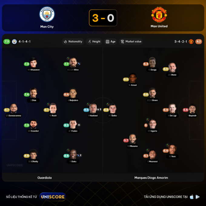 Dựa theo dữ liệu từ chuyên trang tỷ số trực tuyến Uniscore, Pep Guardiola bố trí sơ đồ 4-3-3 linh hoạt, với Rodri án ngữ trung tuyến, Foden và Reijnders điều phối lối chơi, còn Doku - Haaland - Bernardo Silva đảm nhận hàng công. Man City tập trung khai thác cánh phải của MU, nơi Doku liên tục vượt qua hậu vệ đối phương. Chân chạy cánh người Bỉ tạo ra bốn đường chuyền quyết định, trong đó có hai kiến tạo thành bàn. Đặc biệt, pha kiến tạo đầu tiên của anh xuất hiện từ hành lang trong bên cánh phải - một tình huống bất ngờ khiến hàng thủ MU không kịp phản ứng. Sau khi dẫn bàn, City chuyển sang phòng ngự phản công, tận dụng tốc độ của Doku và Haaland cùng sự sáng tạo từ Bernardo Silva và tân binh Reijnders.