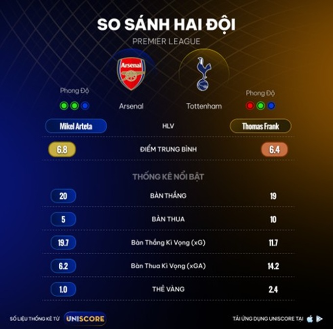 Derby Bắc London luôn chứa đựng sự căng thẳng và khó lường, nhưng bước vào vòng 12 Premier League năm nay, Arsenal và Tottenham đối diện nhau với những hành trang rất khác biệt. Trước thềm cuộc đối đầu đầy duyên nợ này, hãy cùng Uniscore phân tích những con số thống kê đáng chú ý xung quanh hai đại diện ưu tú của nền bóng đá thủ đô nước Anh.