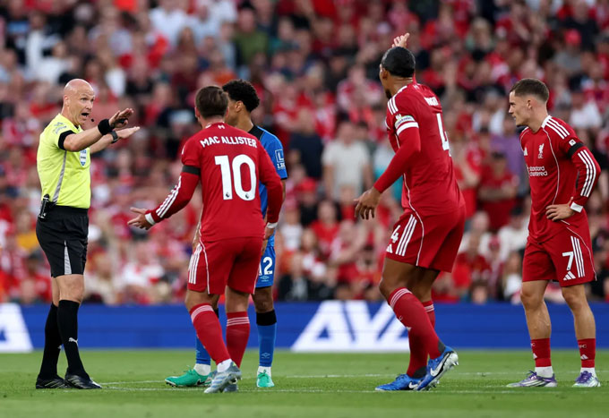 HLV Arne Slot của Liverpool tỏ ra vô cùng tức giận, cùng với đó là các cầu thủ áo đỏ đồng loạt khiếu nại. Tuy nhiên, bất chấp phản ứng dữ dội, VAR vẫn không vào cuộc.