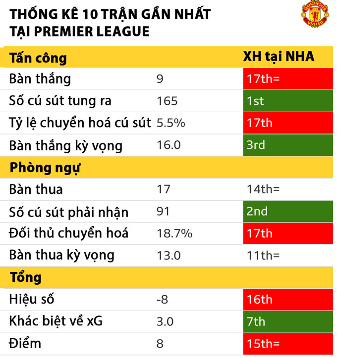 Thực tế, trong 10 trận vừa qua, MU là đội tung ra nhiều cú sút nhất Premier League. Ở chiều ngược lại, chỉ có Man City là để đối phương sút ít hơn.