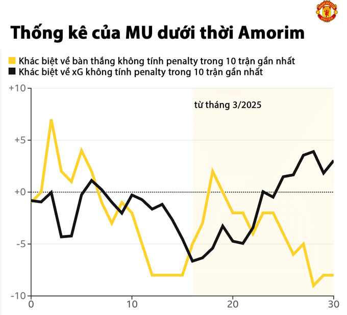 Nếu nhìn vào 30 trận Premier League dưới thời Amorim, dù khởi đầu từ một nền tảng thấp, MU đã cải thiện dần kể từ đầu tháng Ba. Họ tạo ra nhiều cơ hội hơn, chất lượng hơn đối thủ (đường màu vàng), ngay cả khi kết quả trên bảng điểm (đường màu đen) chưa phản ánh đúng thực tế.