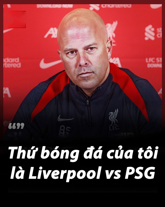Ngay từ mùa trước, Arne Slot đã xem hai trận đấu với PSG ở Champions League là kiểu bóng đá lý tưởng mà Liverpool cần hướng tới. Khi được hỏi liệu Liverpool có thay đổi cấu trúc và cách tiếp cận trận đấu hay không, Slot thẳng thắn trả lời: “Bóng đá của tôi là PSG vs Liverpool, Liverpool vs PSG”.