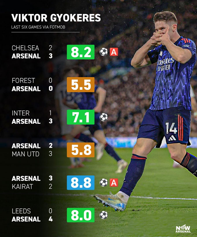 Chuỗi ngày thăng hoa của Gyokeres khởi đầu từ trận đấu với Chelsea, nơi anh thi đấu đầy năng nổ và trực tiếp ghi 1 bàn cùng 1 kiến tạo, góp phần giúp Arsenal giành kết quả tích cực trước đối thủ truyền thống.