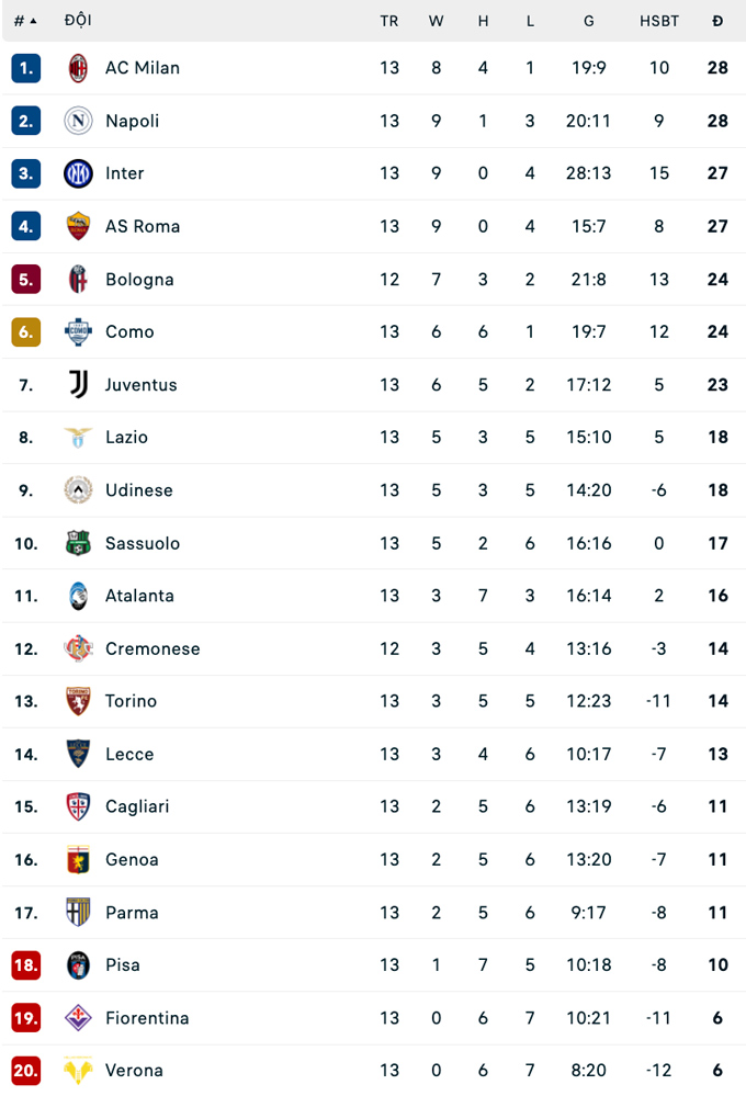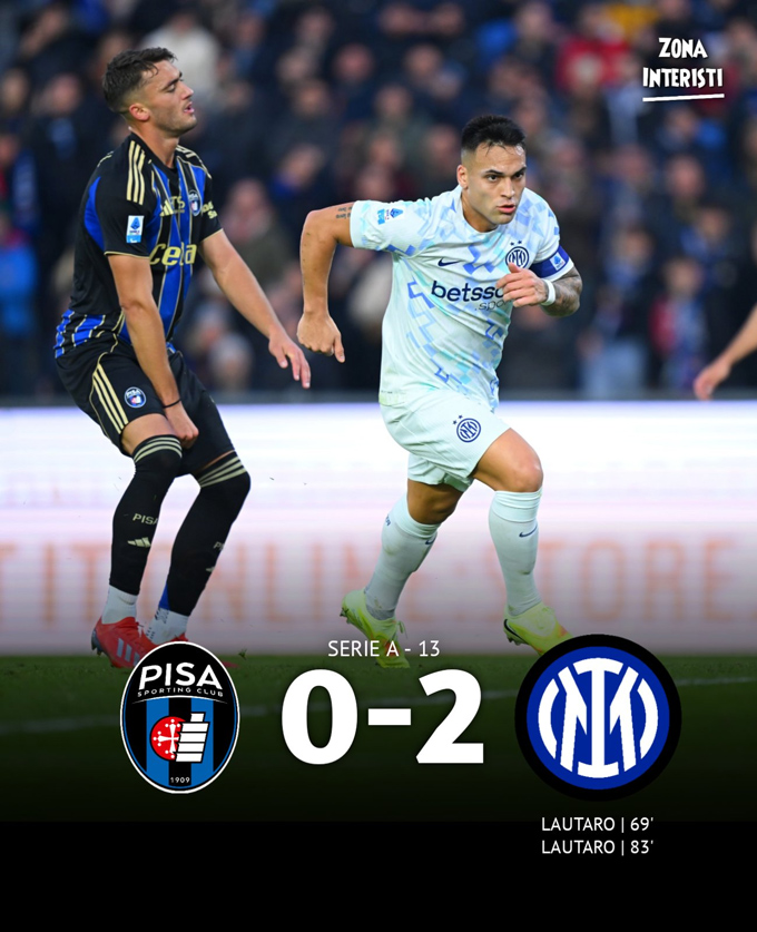 Đánh bại Pisa, Inter leo lên vị trí thứ 3 với 27 điểm sau 13 trận. Họ ít hơn Napoli và Milan đúng 1 điểm và xếp trên Roma do bằng điểm nhưng hơn về chỉ số phụ.