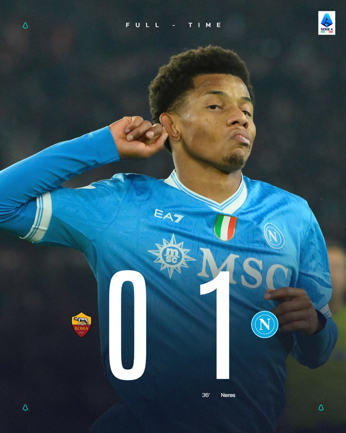 Napoli phải làm khách tới sân của AS Roma nhưng lại là đội vượt lên dẫn trước ở phút 36 sau khi Rasmus Hojlund kiến tạo cho David Neres ghi bàn mở tỷ số.
