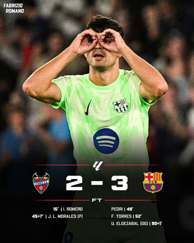 Ngay đầu hiệp hai, Barca có bàn gỡ đầu tiên. Người lập công là Pedri với cú dứt điểm từ xa đẳng cấp. 3 phút sau, Torres đá nối trong tư thế khó khiến thủ thành Cunat của Levante không kịp phản xạ và Blaugrana gỡ hòa ở phút 52. Phải tới phút 90+1, Barca mới có bàn ấn định chiến thắng 3-2 khi Yamal tạt bóng và Elgezabal đánh đầu phản lưới nhà.