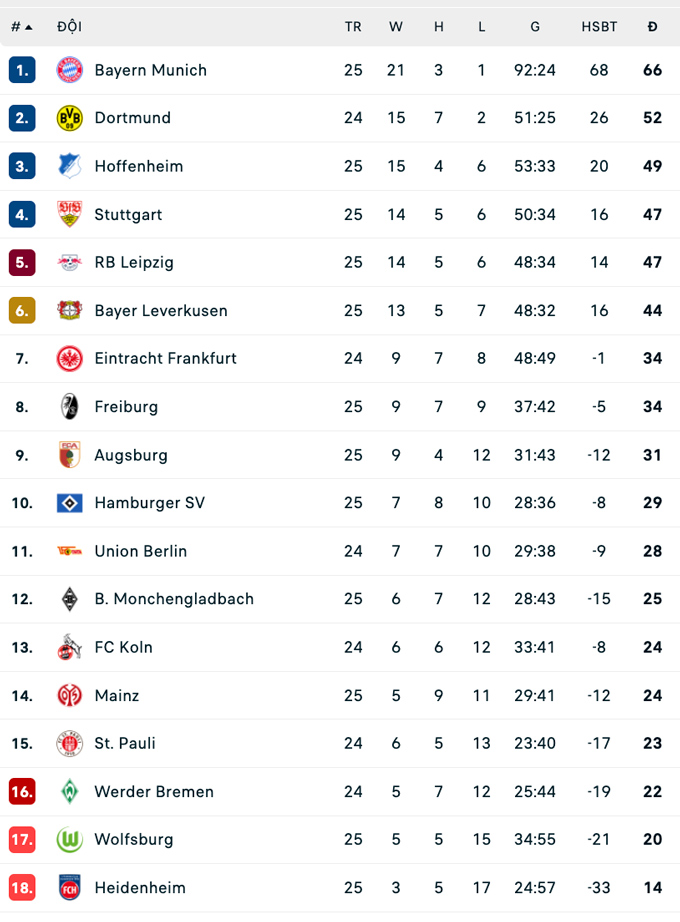 Ở các trận đấu còn lại, Hoffenheim có chiến thắng 4-2 trên sân của Heidenheim, Stuttgart hòa 2-2 trên sân của Mainz trong khi Hamburg đánh bại Wolfsburg 2-1.