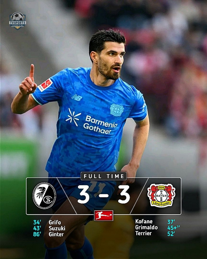 Ngay đầu hiệp 2, Terrier đưa Leverkusen lần đầu vượt lên dẫn trước. Nhưng đến phút 86, Ginter đã ghi bàn ấn định tỷ số 3-3, khép lại trận cầu đầy hấp dẫn.