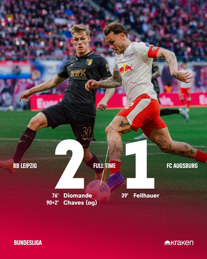 Augsburg giữ nguyên lợi thế tới tận phút 76, trước khi Diomande ghi bàn gỡ hòa cho RB Leipzig. Và tới phút 90+2, pha phản lưới nhà của Chaves đã giúp đội chủ nhà RB Leipzig có trọn 3 điểm.
