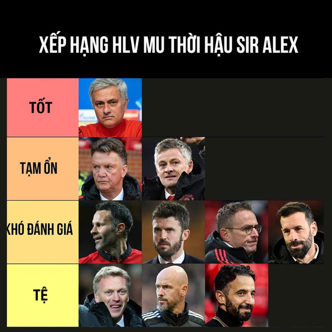 Ten Hag dù mang về chức vô địch League Cup 2023 và FA Cup 2024 nhưng hai mùa giải rối ren, mâu thuẫn nội bộ và thành tích tệ hại khiến ông bị xếp ở nhóm thấp nhất.