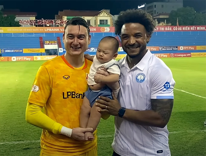 Trong những bức ảnh kỷ niệm giữa đôi bên, Nguyễn Xuân Son còn bồng bế cậu con trai kháu khỉnh nhà Văn Lâm. Thủ thành Việt kiều nói với vợ rằng đùi của em bé nhà mình to, y chang chân của tiền đạo Xuân Son. Anh thậm chí còn làm động tác vui vẻ, xin vía để con trai mạnh khoẻ, sau này có thể nhanh nhẹn, mạnh mẽ và uy lực như màn thể hiện của chân sút sinh năm 1997 trên sân cỏ, trong màu áo Nam Định và ĐT Việt Nam.